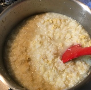 ドロドロのおかゆが、サツマイモを入れて混ぜてると、サラサラに変わるんです!